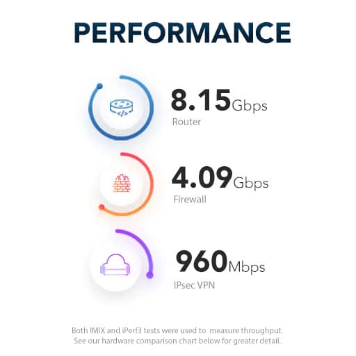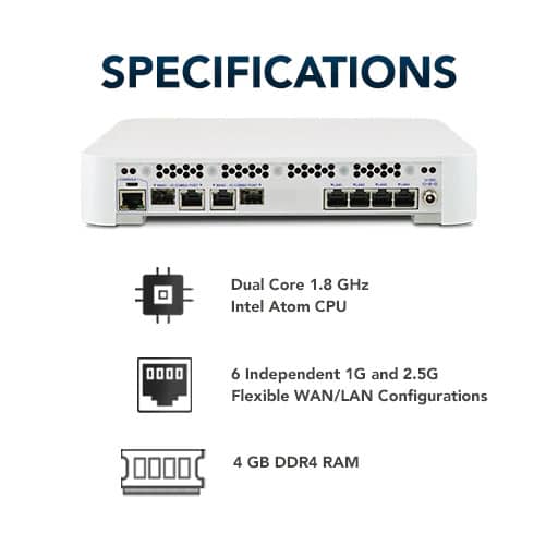 Il Netgate® 4100 con software pfSense® Plus è uno dei gateway di sicurezza più versatili della sua categoria. Combina la potenza di una CPU Dual-Core Intel® Atom® C3558 con QuickAssist integrato e AES-NI, insieme a 4 GB di memoria, garantendo un’esperienza utente fluida e oltre 8,15 Gbps di routing L3 attraverso sei porte WAN/LAN flessibili indipendenti – (2) 1 GbE e (4) 2,5 GbE.