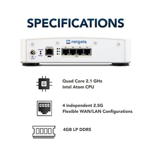 Il Netgate 4200 è ideale per ambienti pro-home, piccole/medie imprese, filiali e implementazioni edge che richiedono configurazioni di porte flessibili per supportare capacità WAN da 1 a 2,5 Gbps attraverso quattro porte LAN RJ-45 ethernet da 2,5 Gbps indipendenti e non commutate, il tutto in un design desktop silenzioso.