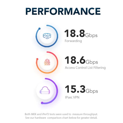 This system combines the power of TNSR with an 8-Core Intel® Atom® C3758R CPU with integrated QuickAssist & AES-NI, and 16 GB of memory delivers over 18 Gbps of L3 routing across 8 Independent 1 GbE, 4 2.5 GbE, and 2 10 GbE Flexible WAN/LAN ports.